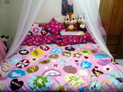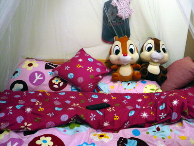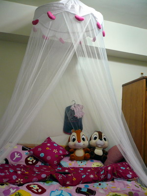 這是搬新家後的公主床床單一樣沒換我超愛這個床單的好可愛~~~不過多了一個帳棚夢幻可愛的公主棚可惜沒找到粉紅色的床上兩隻娃娃是可愛鬼送的真是可愛呢!!牆上掛的是寶貝們的衣服今年還沒給他們穿到呢遠拍的樣子帳棚上的愛心很可愛但拍起來暗暗的是相機差還是技術差就不計較了睡公主床就要來點點心這是我的宵夜讓我胖死好了!!!